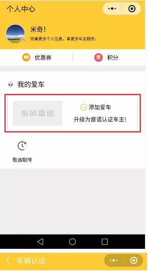 雷諾車主,廠家福利大派送 小諾準(zhǔn)備大聲地告訴您: 是時(shí)候動動手 把小諾為您準(zhǔn)備的精美禮品 帶回家啦! 一等獎:東風(fēng)雷諾云伴遠(yuǎn)程視頻車 二等獎:東風(fēng)雷諾反向傘 方便車主而貼心設(shè)計(jì),大雨來臨之時(shí),只需小小的車門縫,就可以開收傘自如。 三等獎:東風(fēng)雷諾定制手機(jī)支架 強(qiáng)韌有力的工藝設(shè)計(jì),保證手機(jī)在行車途中不會晃動、掉落。讓開車接聽電話更安全。 諾米們是不是已經(jīng)按捺不住了 快跟著小諾 收下攻略,動動手指 把禮品帶回家吧! 先關(guān)注東風(fēng)雷諾車友會官方微信公眾號 返回東風(fēng)雷諾車友會主頁面,點(diǎn)擊左下角菜單欄【個人中心】,進(jìn)入車主認(rèn)證通道。 認(rèn)真填寫愛車信息,上傳行駛證主頁、副業(yè)。在行駛證上能找到您的車輛識別代號和發(fā)動機(jī)號,再輸入手機(jī)號和驗(yàn)證碼,即可綁定成功啦! 完成認(rèn)證,便可以開始抽獎啦!注意:一位車主只有一次抽獎機(jī)會哦。 如您中獎,您將會收到一條中獎短信通知 務(wù)必在1個月內(nèi)憑中獎短信到武漢法雷專營店領(lǐng)取禮品 *注:本次活動僅限未認(rèn)證會員的車主參與